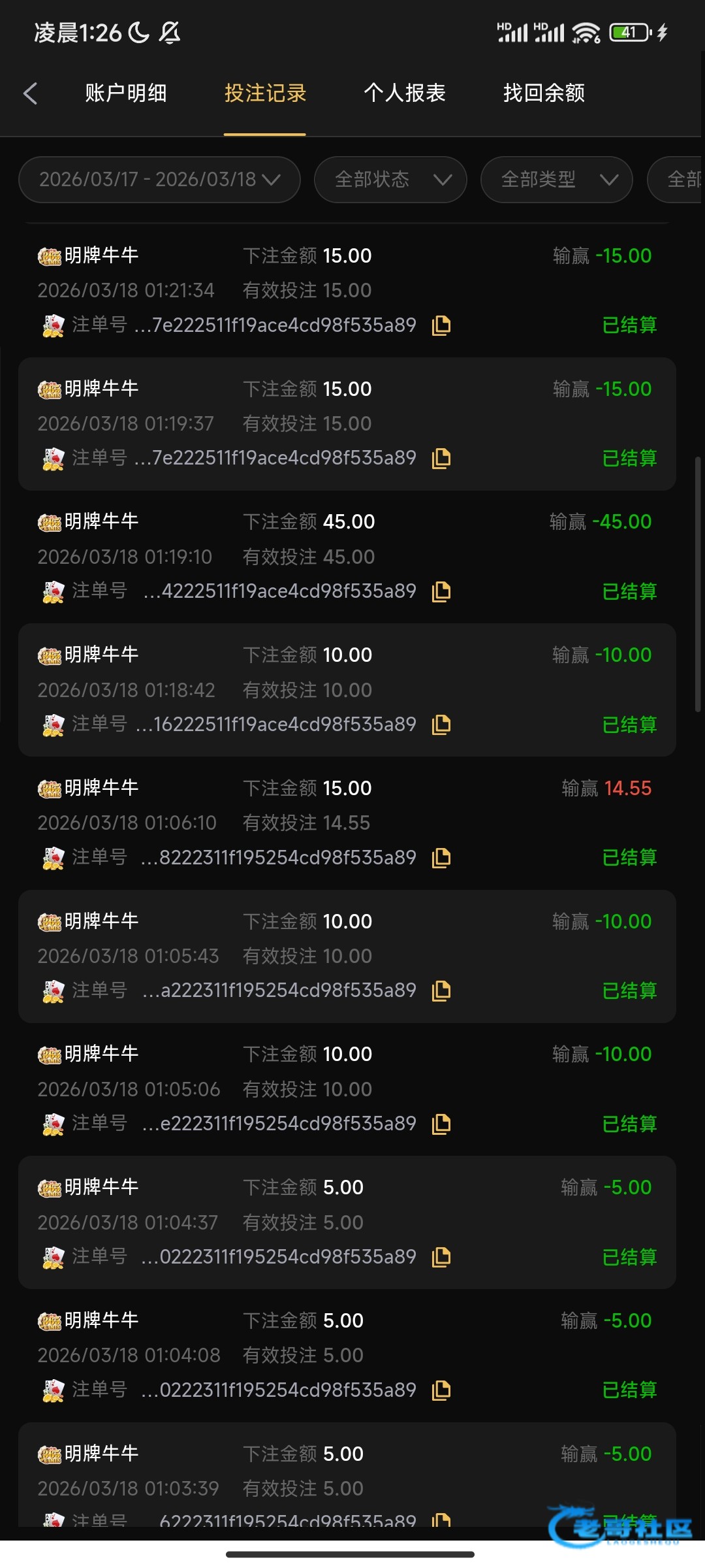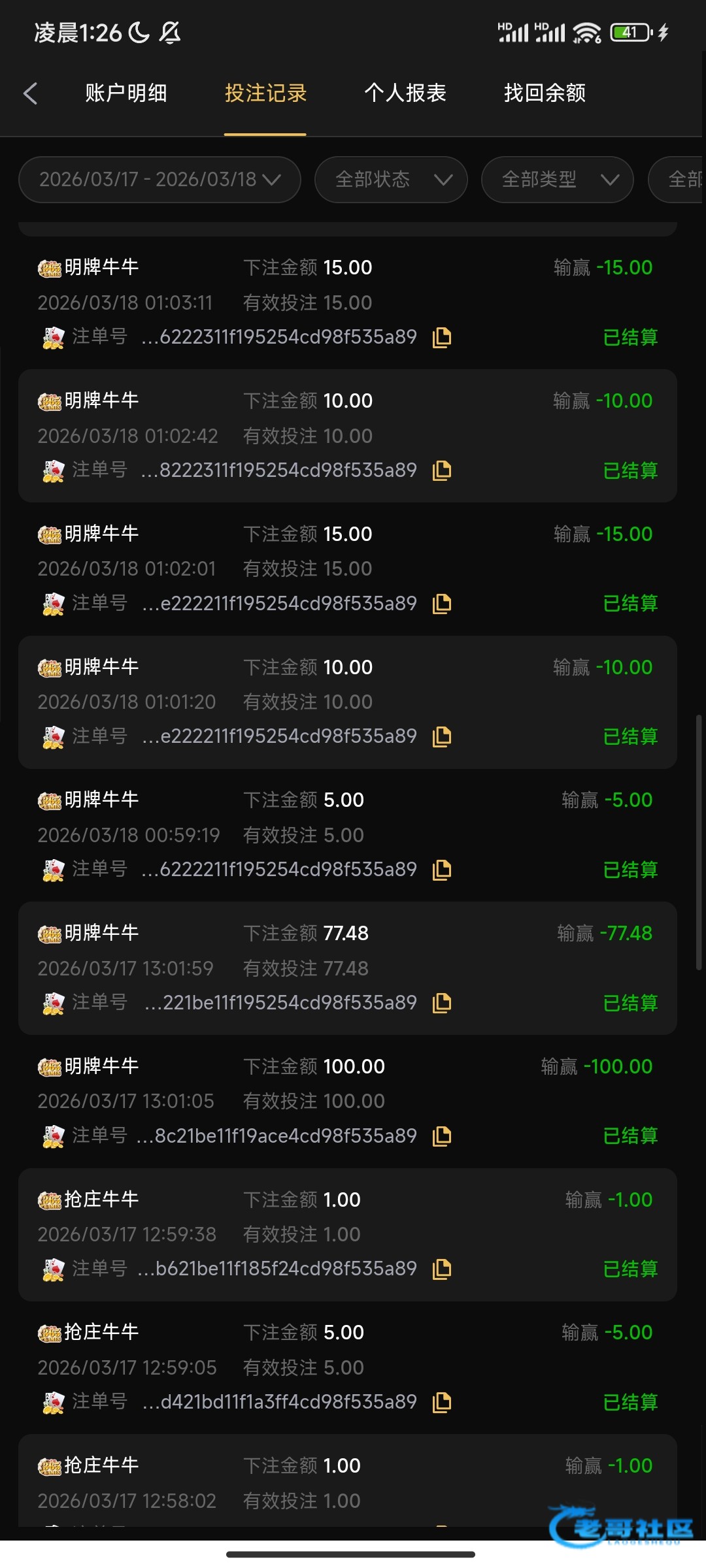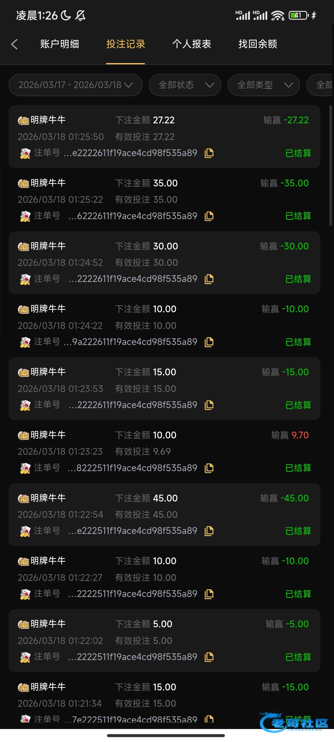 输100和70多的是抢庄了,除掉后26把 全是不抢庄不加注,只有2把牌比得过庄!!最后3把看我输得慢,我没抢庄其他机器人也不抢 硬连塞给我3把庄。不知道是平台问题,还是这个365棋牌问题,总之遇到别玩 避雷吧!