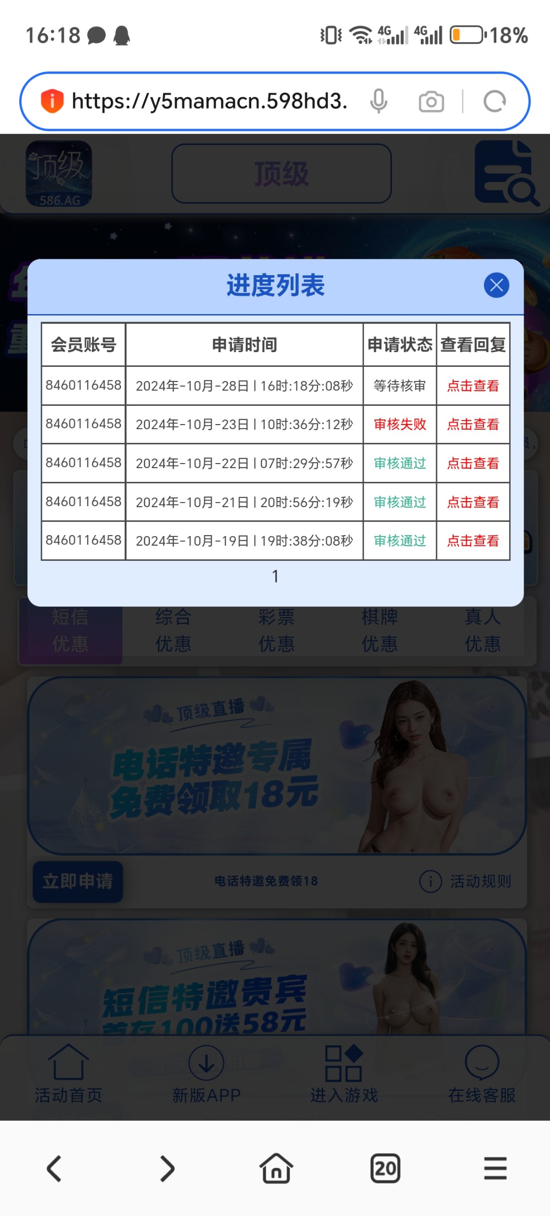 586.ag 找客服要链接申请,第一次碰瓷别人发的给了,打挂了,后面又打电话来又给了一次,白嫖1000+
