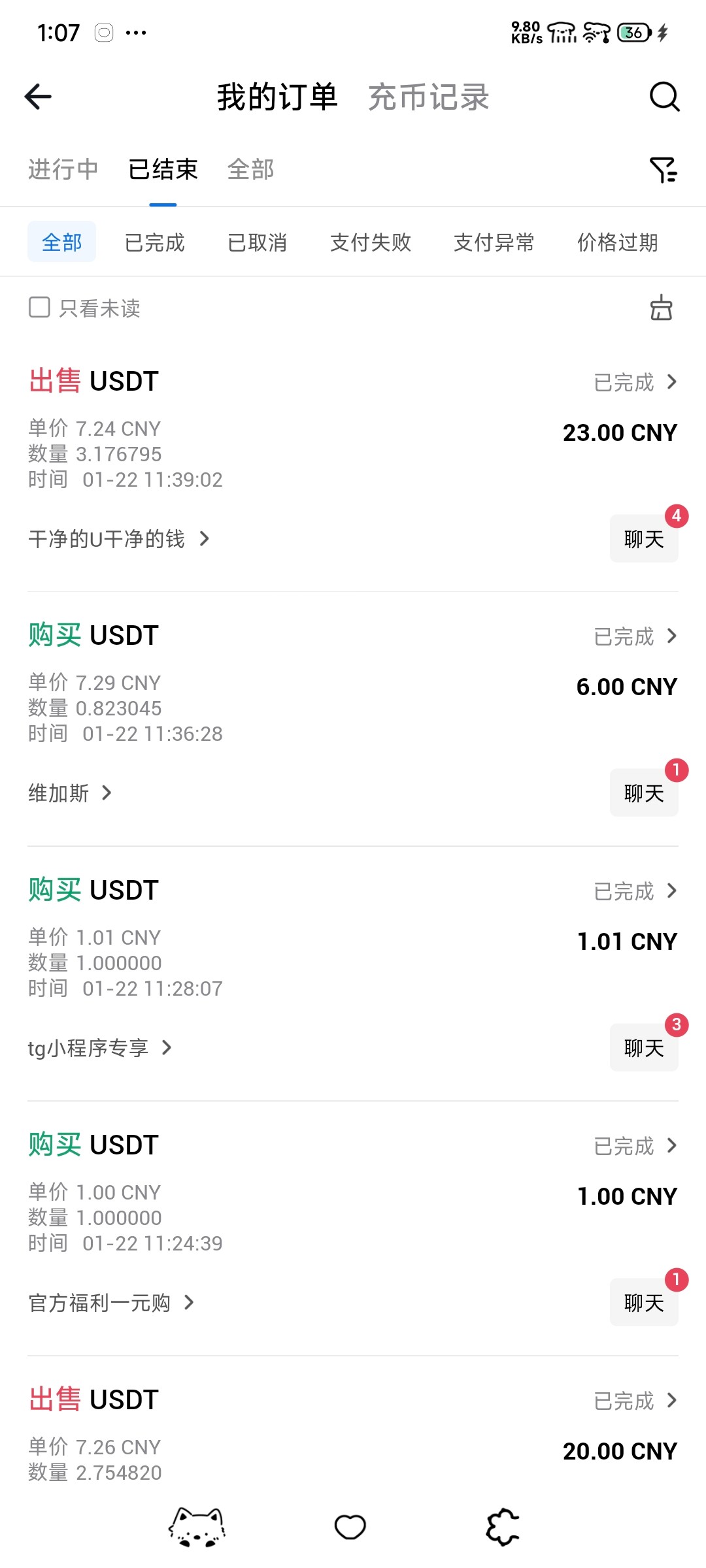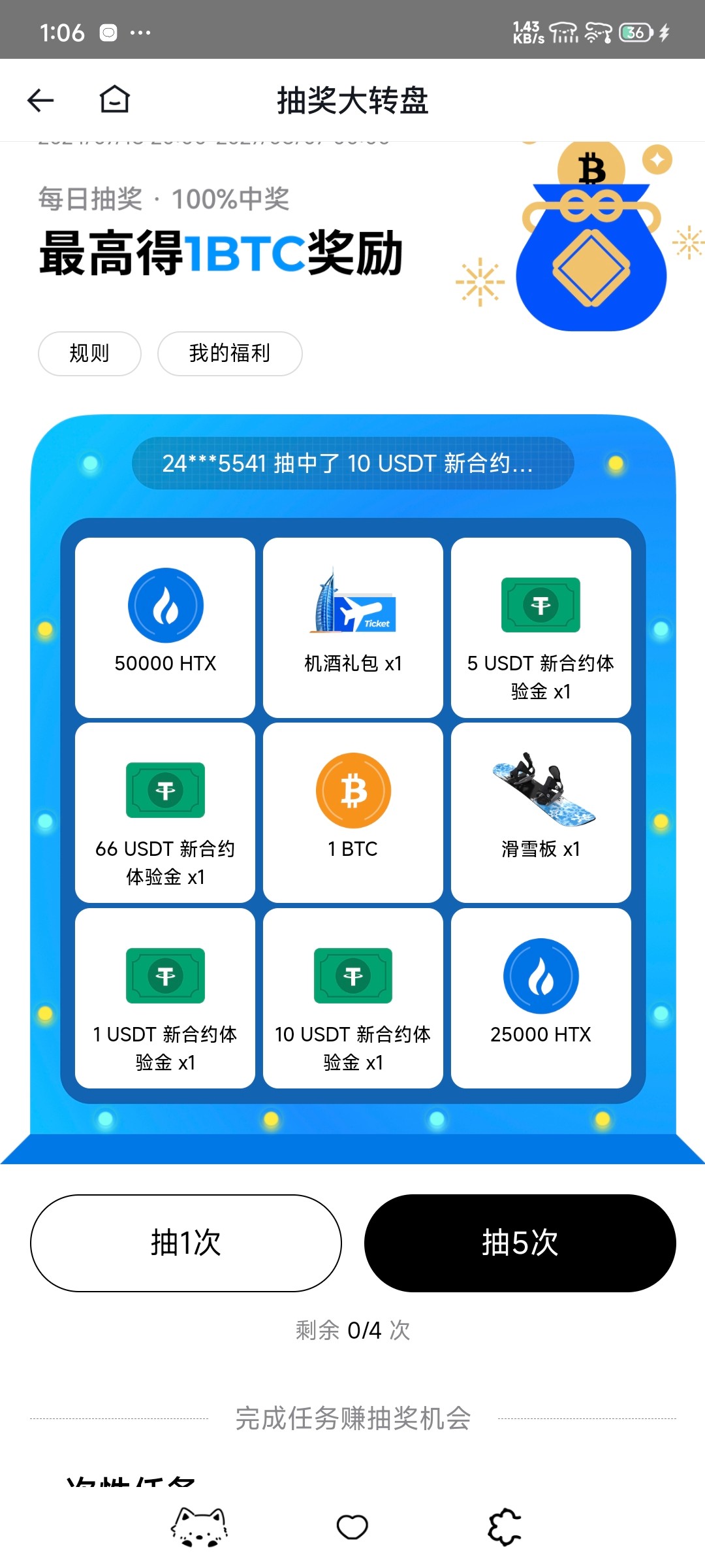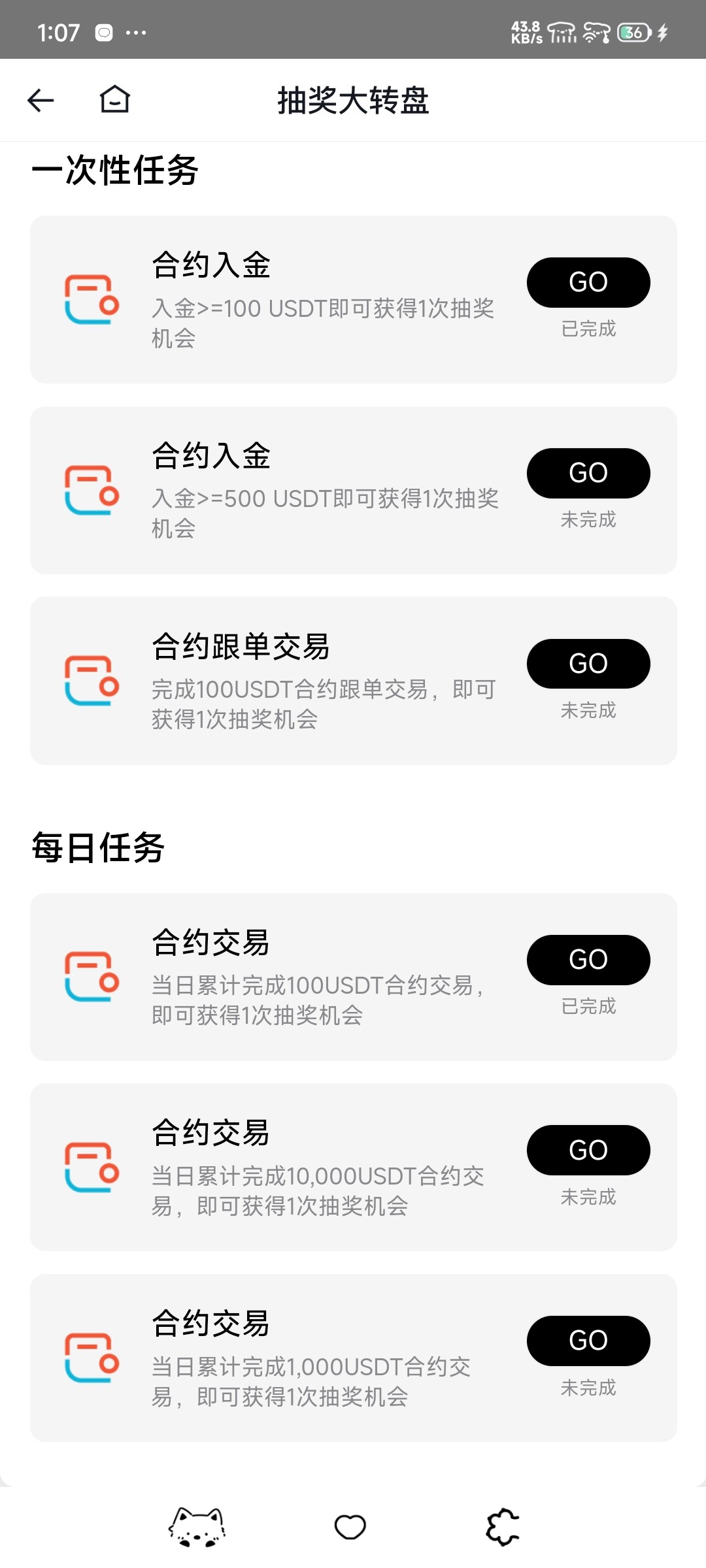 然后第二个活动是在合约那里,这两个活动可以一起弄抽奖就看运气,任务可以一直转进合约账户和再转出去现货账号完成,最好先把体验金花完再弄,然后c2c还有一个可以1块钱买1usdt的活动每天都可以买,最低3U出售相当于20块钱才能卖