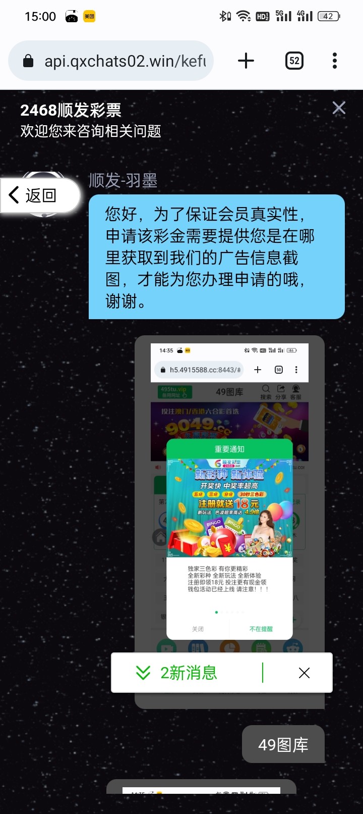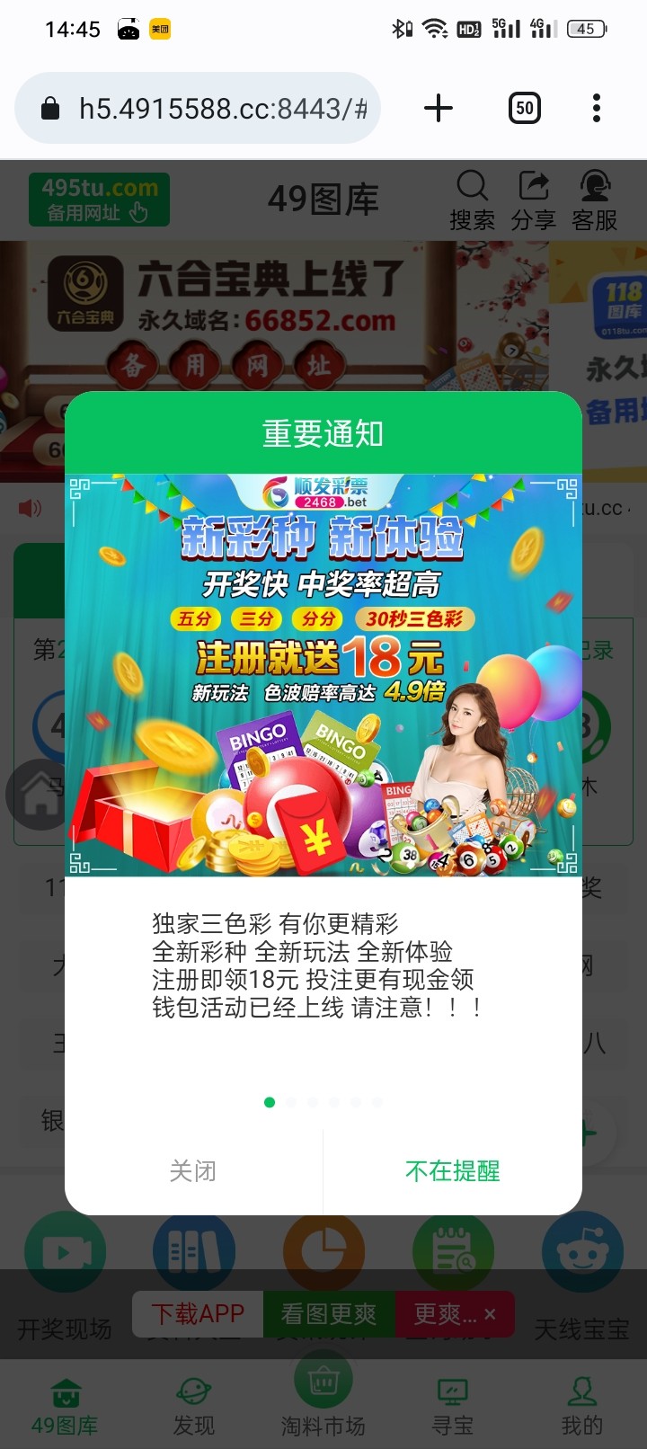 弹出这个图片之后呢,注册送18这个图片点一下就进去了,记得保存一下的这个图,客服,如果要地址的话,就把这个图片发给他就行