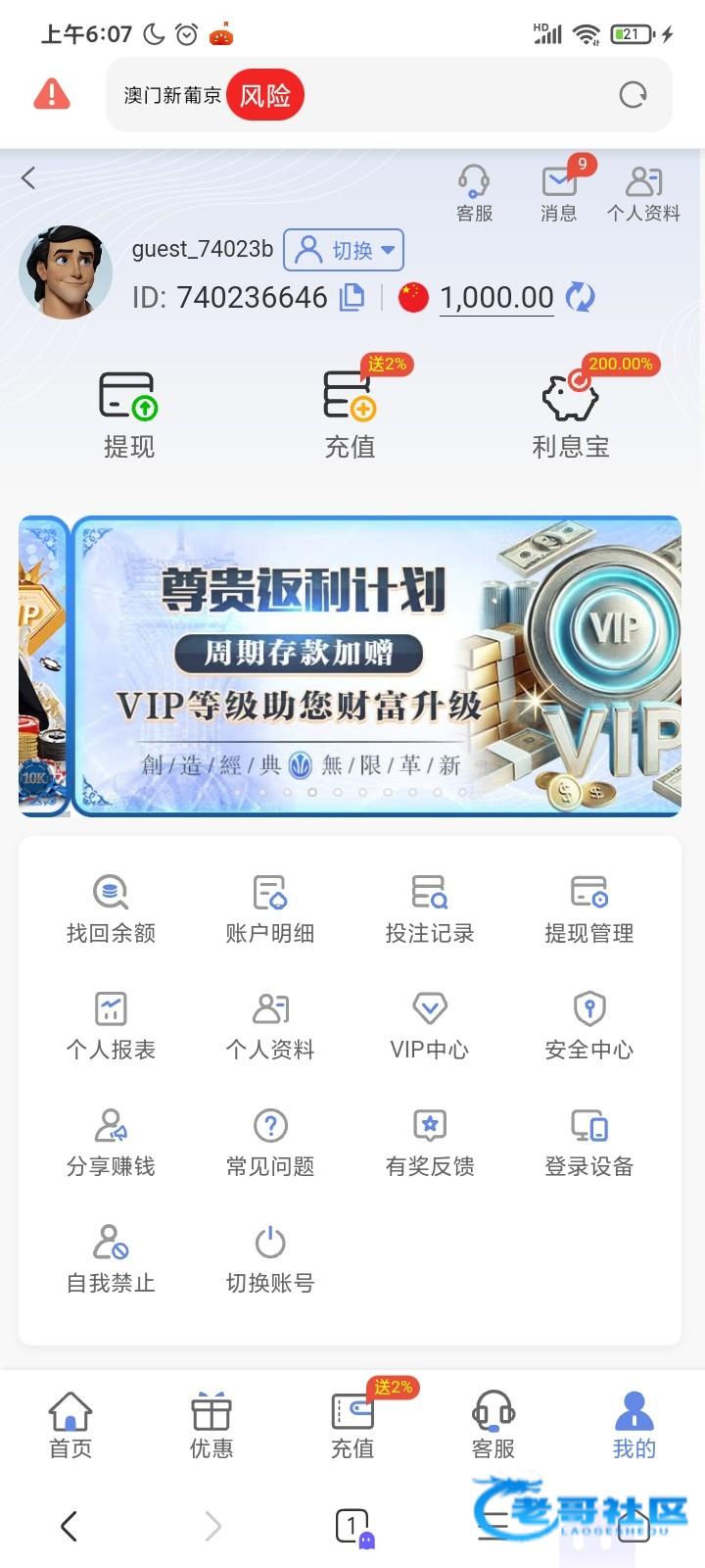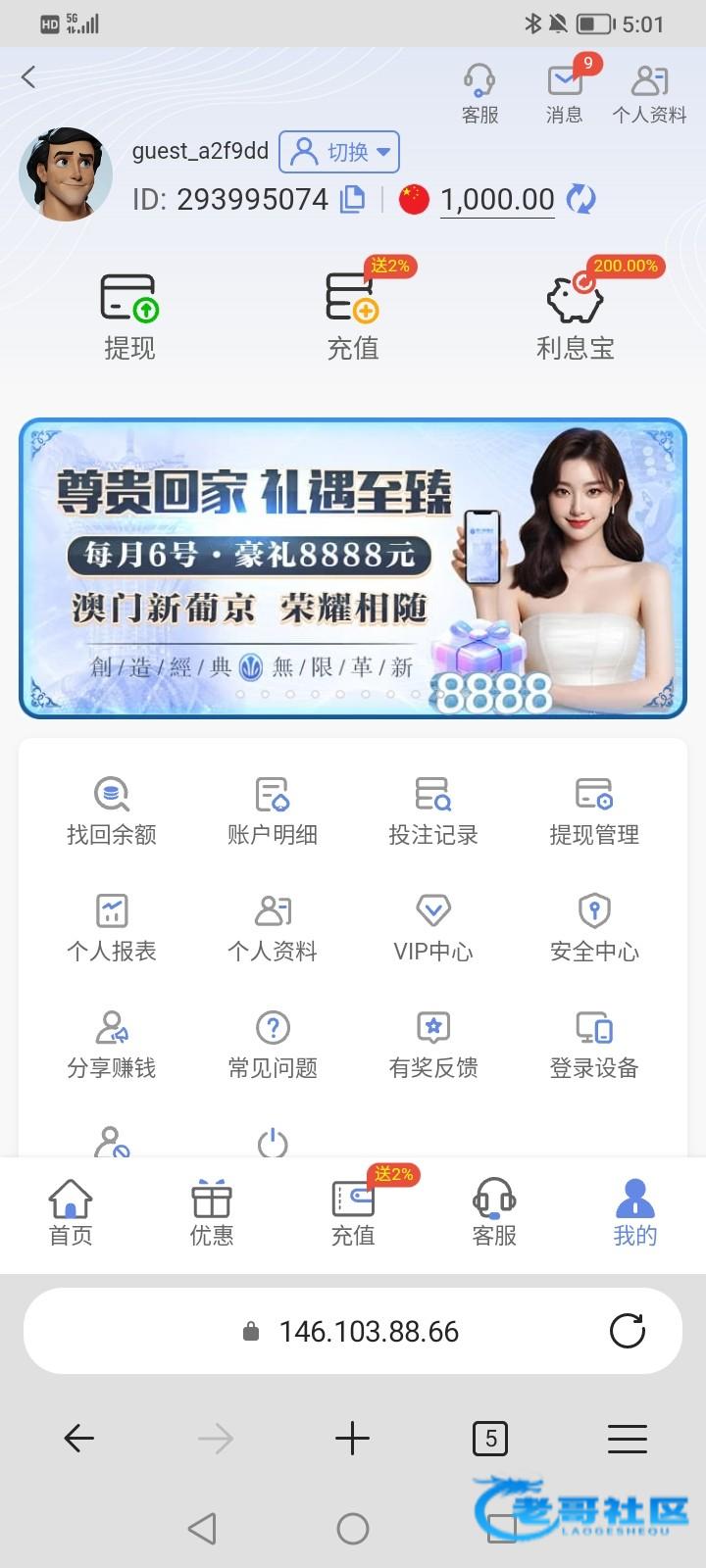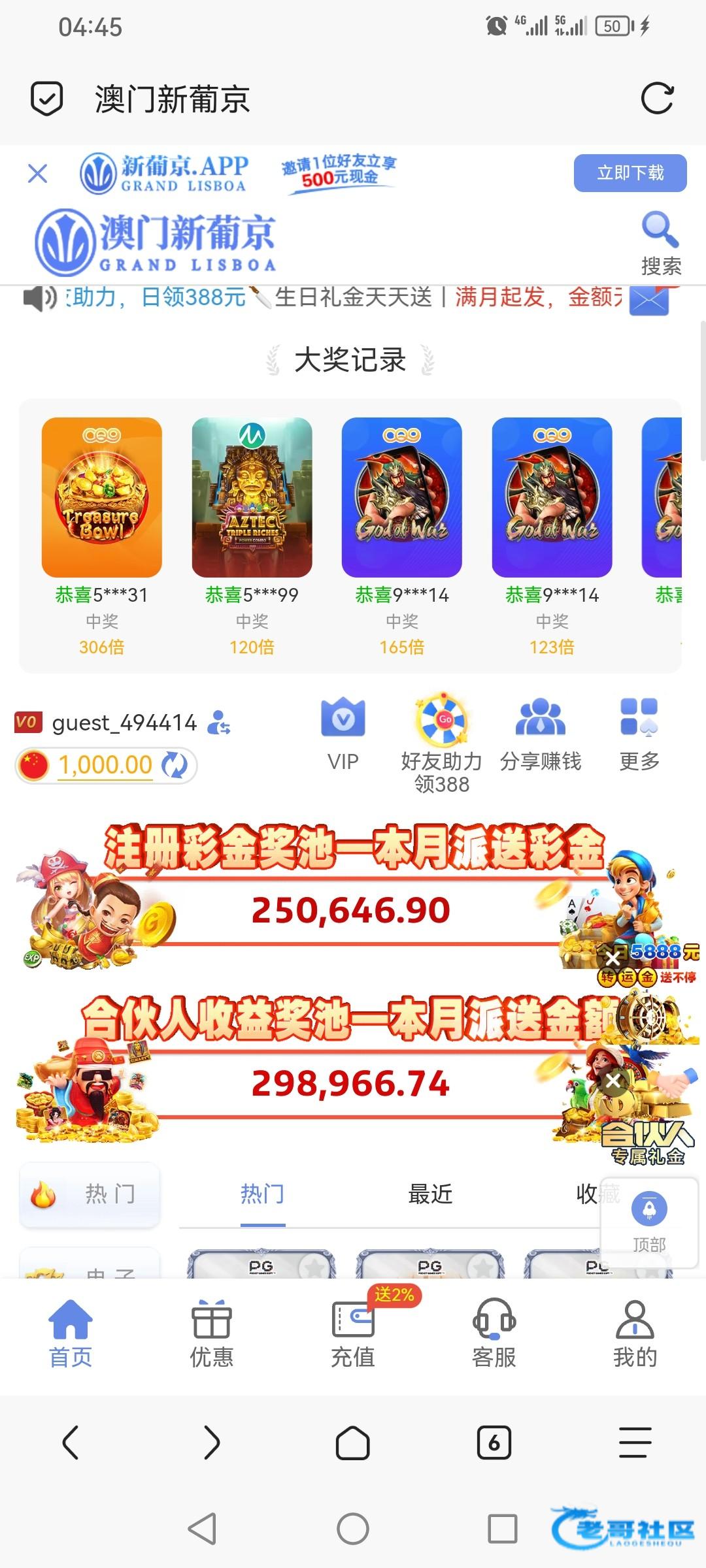 网站:新葡京.app,之前短信特邀注册的,然后充值过100,今天月初无聊登了好几个网站,发现这个网站有18.88,有号的去看一下,还出款了400