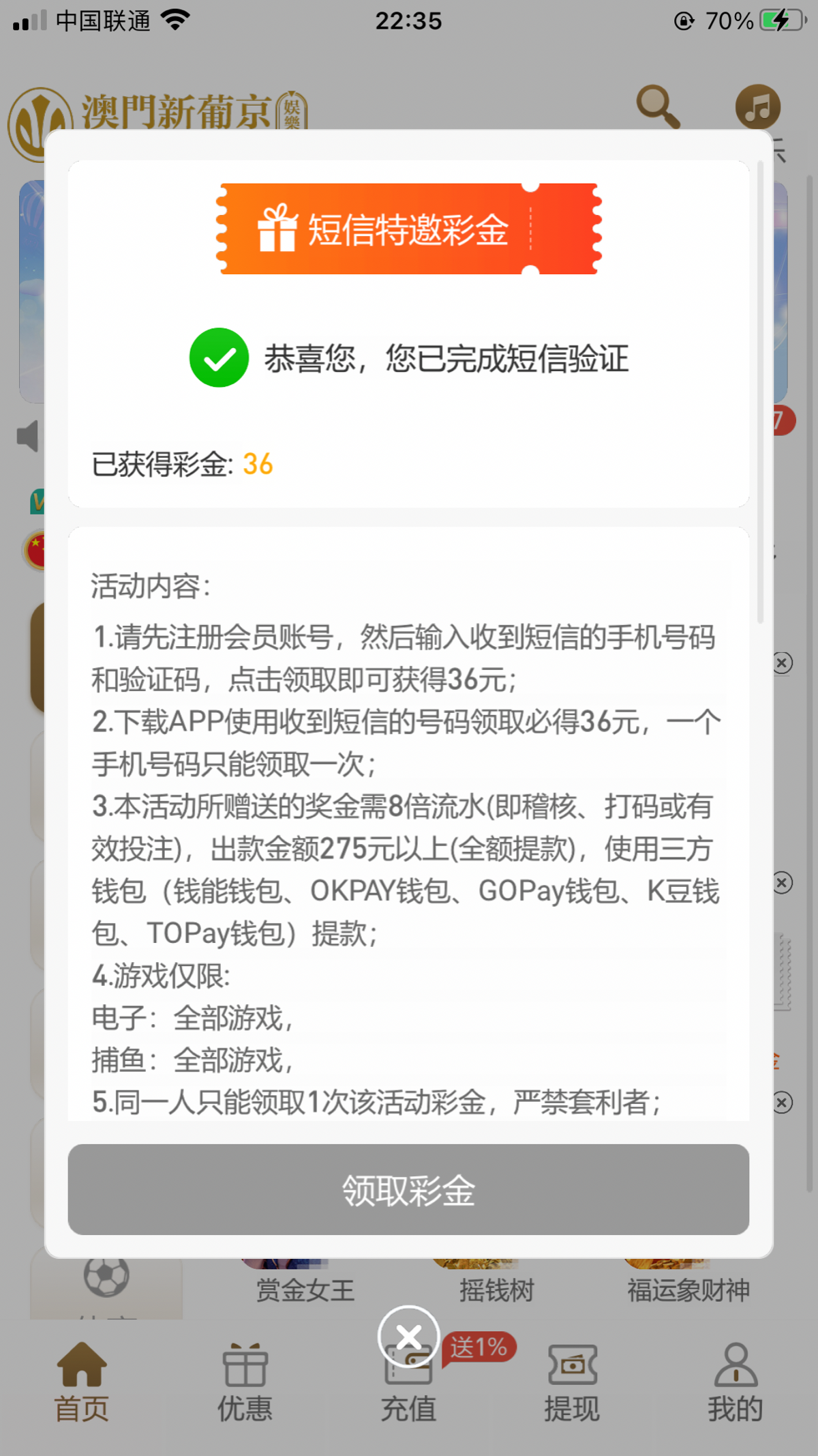 都去看看有没有这个短信 注册新号下载app 优惠里面验证手机号码送36,8杯水275提款,没提过款,出款自测