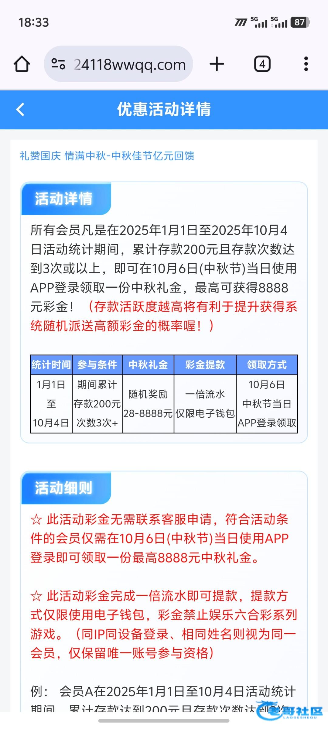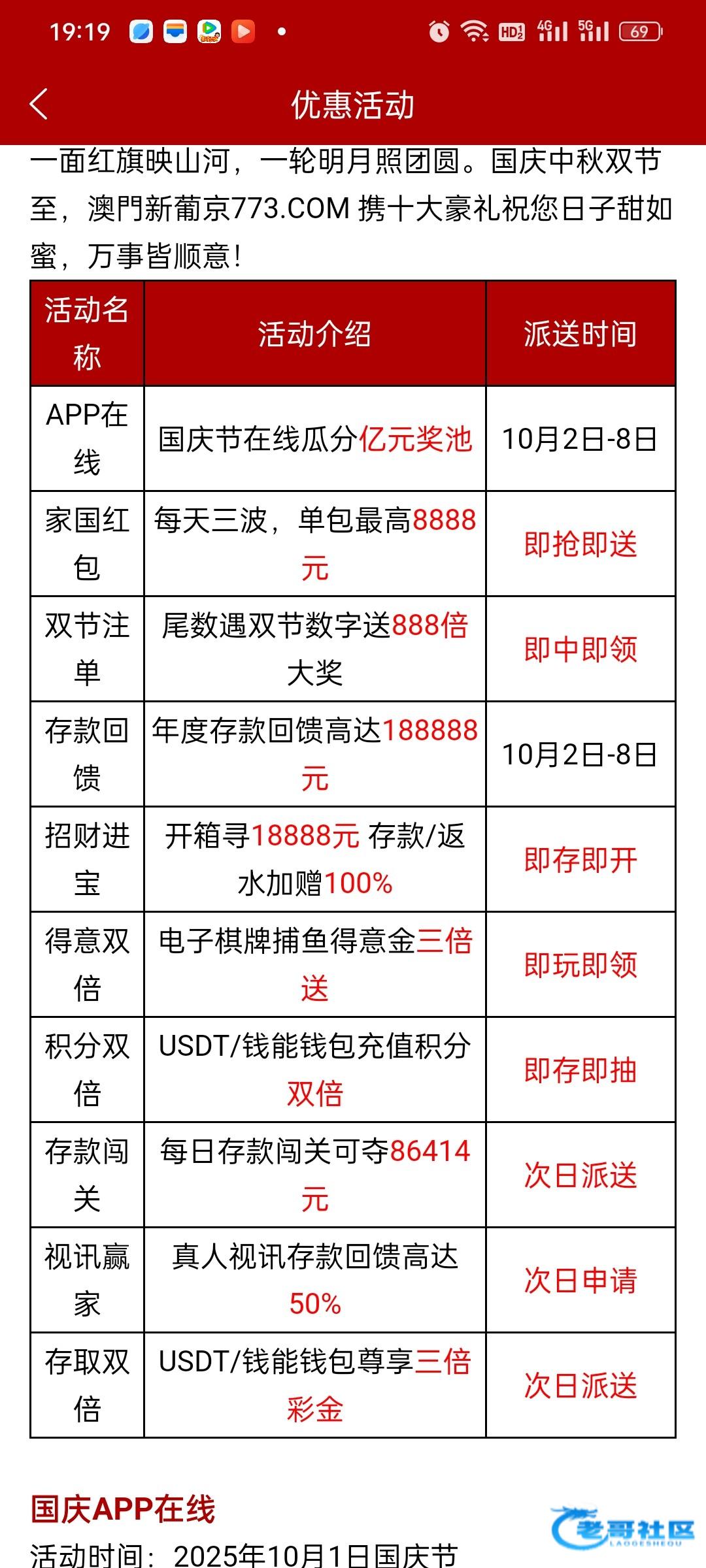 国庆节和中秋节在一起,狗庄把中秋和国庆一起办了,目前小蓝版最低回馈是28,而且中秋节才能领,精彩系列目前还没看到,估计应该也有个保底,其他模板是指望不上了,基本都是国庆期间需要充值才能领到彩金,搞完国庆后面就没什么搞头了