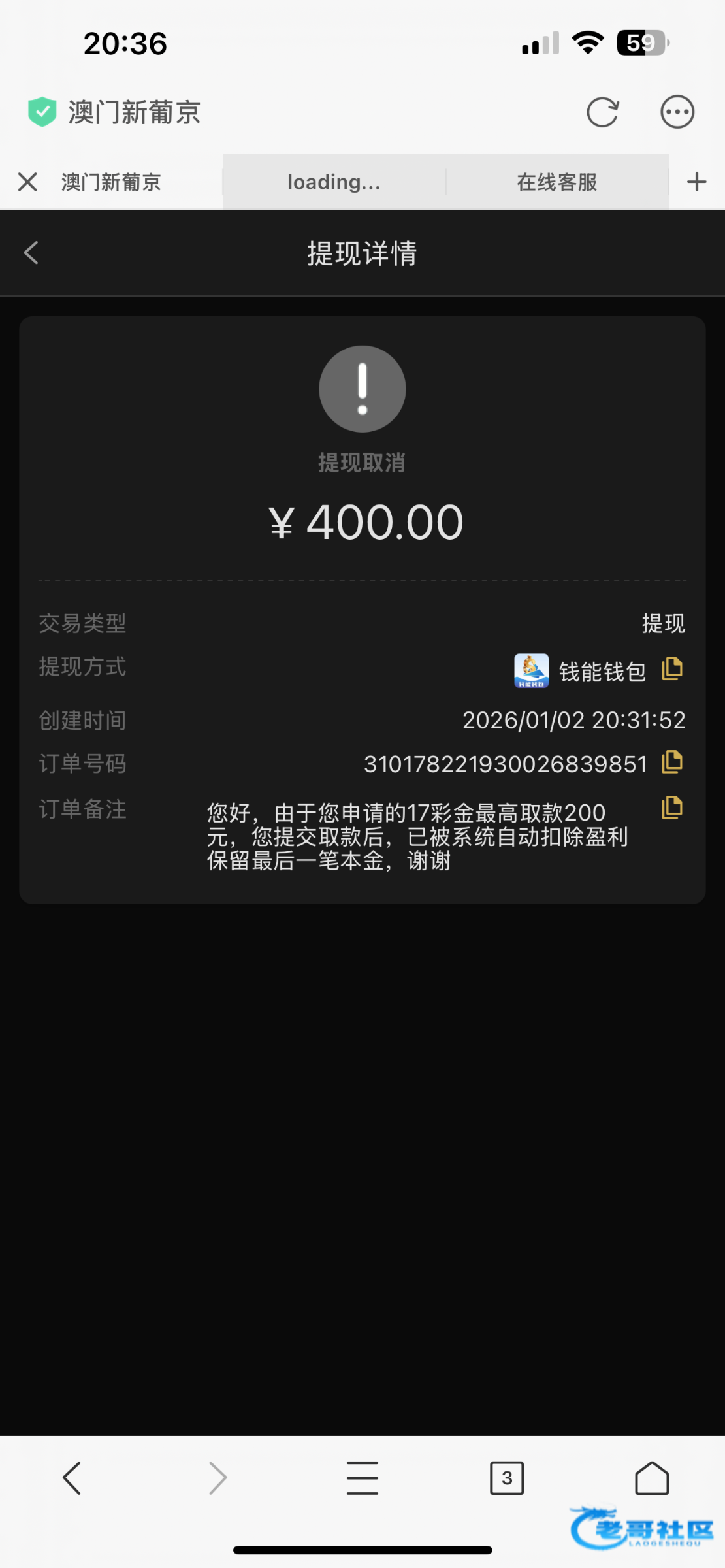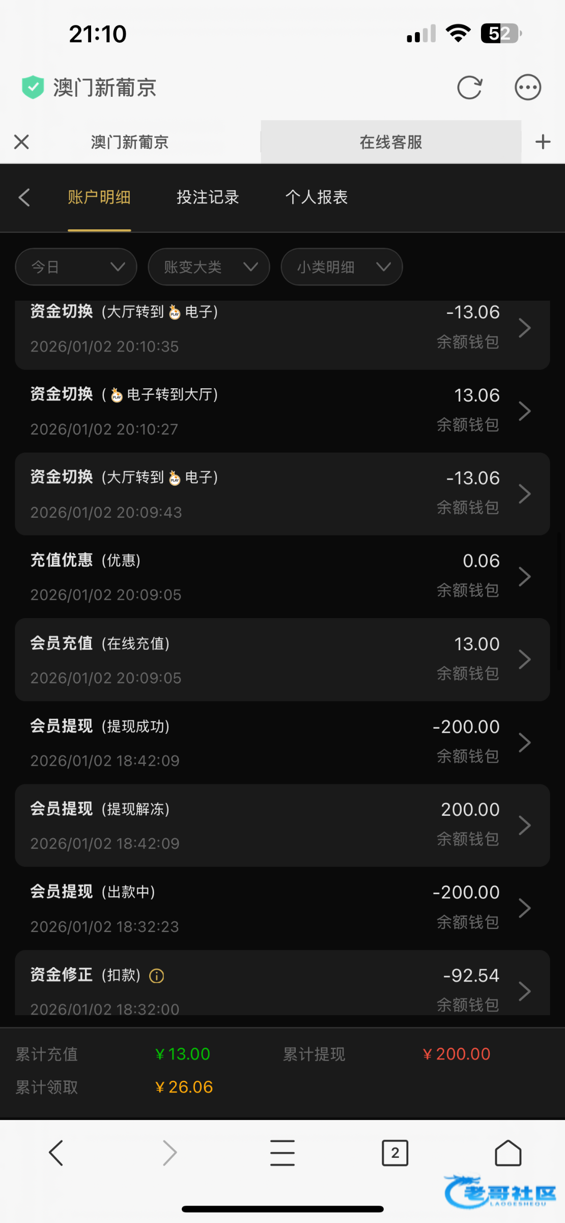 我一开始领取的26彩金,打到300多提现200剩下的全部扣了,然后我账户¥0的情况下我自己冲13玩一下,打到600多,想提现400继续玩然后直接全部扣了,冲钱玩的黑的理由是我领取了短信彩金,短信彩金都是我去年11领取的,无限重复这句话,牛比,老哥们注意一下吧白嫖不要冲这个平台